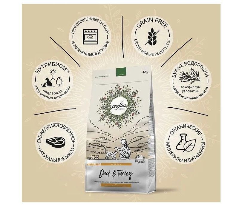 CRAFTIA HARMONA сухой корм для стерилизованных кошек из утки и индейки CRAFTIA HARMONA — корм для кошек ультрапремиум класса, созданный с любовью к природе. Состав кормов CRAFTIA прозрачен и понятен, отсутствуют скрытые добавки и сомнительные ингредиенты. Все, что заявлено в составе корма, гарантированно присутствует в каждой грануле. Собственный завод, сотни квадратных метров научно-исследовательских лабораторий, первоклассное сырье — все это позволяет создавать тщательно сбалансированный высокобелковый корм с холистическим подходом. Все компоненты корма подходят для употребления человеком и не содержат ГМО.