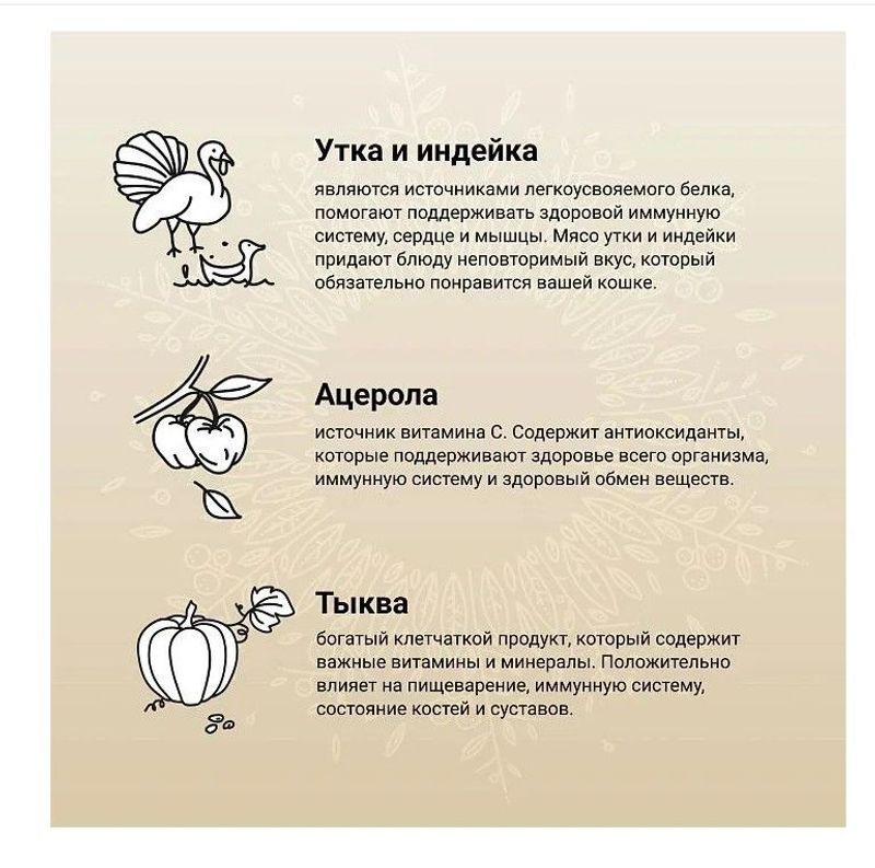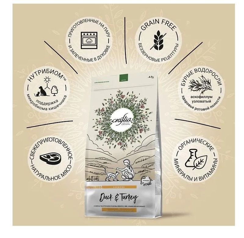 0% химической обработки сырья.Основные источники белка в корме — свежее мясо утки и индейки. Комбинация этих белков легко переваривается, помогает поддерживать оптимальный вес питомца, стабилизирует обмен веществ. Утка и индейка — отличные источники незаменимых аминокислот, витаминов и минералов. Исключен распространенный аллерген — курица. Источники углеводов — предварительно обработанные гороховый крахмал и экстракт семян киноа. Эти компоненты имеют низкий гликемический индекс, а значит — питомец дольше чувствует себя сытым и не переедает. Источники клетчатки — свекольная пульпа, волокна гороха и люцерновая мука. Свекольная пульпа способствует здоровью слизистой кишечника, гороховая клетчатка стимулирует перистальтику, а люцерновая мука способствует размножению полезной микрофлоры кишечника. Суперфуды в корме — спаржа, черника, клюква, ацерола и многие другие. Суперфуды являются источниками витаминов, биологически активных компонентов и обладают антиоксидантными свойствами. Попробуйте Craftia, ощутите уверенность в качестве корма своего питомца — и наслаждайтесь жизнью в гармонии с природой!
