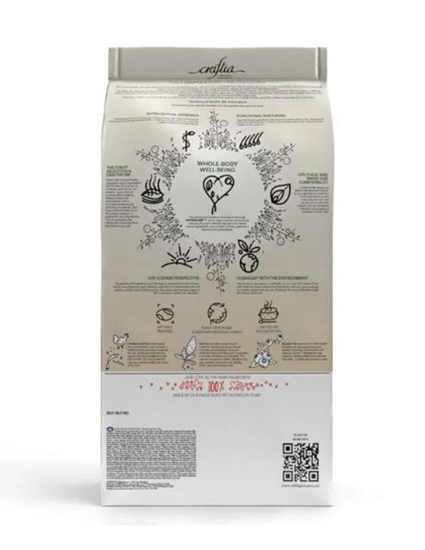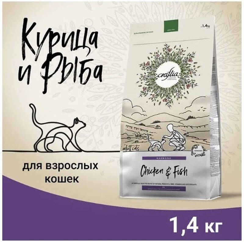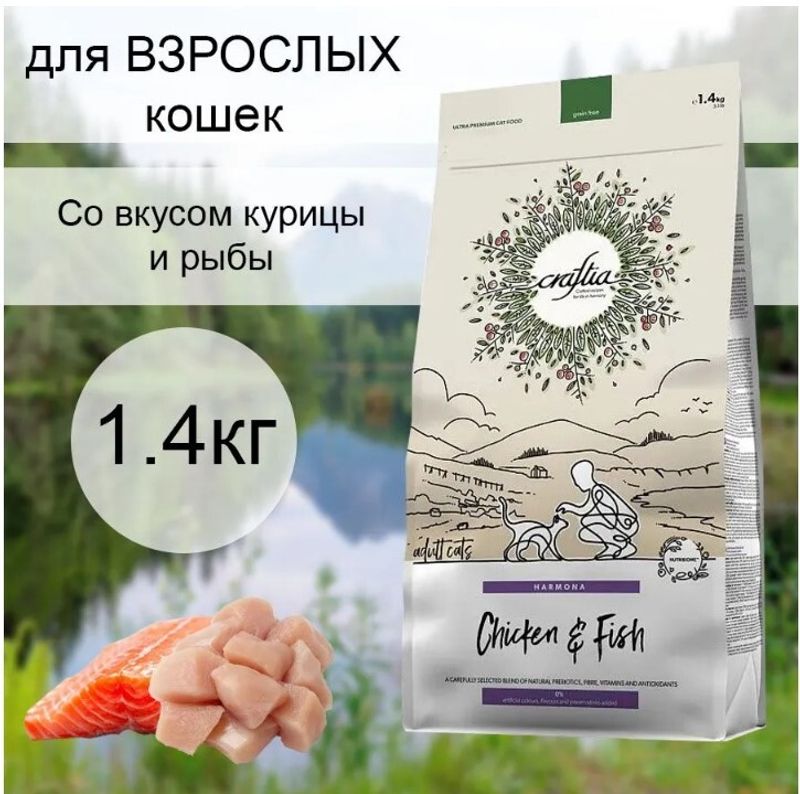 CRAFTIA HARMONA сухой корм для взрослых кошек из курицы и рыбы. CRAFTIA HARMONA — корм кошек для ультрапремиум класса, созданный с любовью к природе.Состав кормов CRAFTIA прозрачен и понятен, отсутствуют скрытые добавки и сомнительные ингредиенты. Все, что заявлено в составе корма, гарантированно присутствует в каждой грануле. Собственный завод, сотни квадратных метров научно-исследовательских лабораторий, первоклассное сырье — все это позволяет создавать тщательно сбалансированный высокобелковый корм с холистическим подходом. Все компоненты корма подходят для употребления человеком и не содержат ГМО.Продукт соответствует высоким стандартам качества и имеет следующие сертификаты соответствия: HACCP, ISO 9001, ISO 14001, ISO 18001, ISO 45001, DQS, IFS.Ингредиент №1 — свежее мясо. Это лучший источник белка из возможных. Кроме того, он делает вкус корма очень привлекательным для питомцев.Запатентованная формула NUTRIBIOME — тщательно подобранная смесь пребиотиков, клетчатки, мультивитаминов, антиоксидантов.Функциональные добавки — Омега-6 и Омега-3. Жирные кислоты помогают поддерживать здоровье кожи и шерсти, играют важную роль в поддержании здоровья сердечно-сосудистой системы, обладают противовоспалительными свойствами.Бурые водоросли ASCOPHYLLUM NODOSUM уменьшают зубной налет, неприятный запах, кровоточивость десен, сокращают образование зубного камня. Получается, что во время еды питомец одновременно чистит зубы: Ascophyllum nodosum размягчает зубной налет, а при жевании сухих гранул этот налет механически удаляется.0% искусственных красителей, ароматизаторов, консервантов.0% ГМО.0% химической обработки сырья.Основные источники белка в корме — свежее мясо курицы, сельдь и лосось. Разнообразные источники животных белков обеспечивают оптимальный аминокислотный состав и набор питательных компонентов. Лосось и сельдь богаты незаменимыми Омега-3 жирными кислотами и минеральными веществами. Жирные кислоты контролируют воспалительные процессы в организме, что хорошо влияет на здоровье суставов. Легкоусвояемый рыбный белок способствует формированию крепкой мускулатуры, улучшает состояние кожи.Источники углеводов — предварительно обработанные гороховый крахмал и экстракт семян киноа. Эти компоненты имеют низкий гликемический индекс, а значит — питомец дольше чувствует себя сытым и не переедает.Источники клетчатки — свекольная пульпа, волокна гороха и люцерновая мука. Свекольная пульпа способствует здоровью слизистой кишечника, гороховая клетчатка стимулирует перистальтику, а люцерновая мука способствует размножению полезной микрофлоры кишечника.Суперфуды в корме — спаржа, черника, клюква, ацерола и многие другие. Суперфуды являются источниками витаминов, биологически активных компонентов и обладают антиоксидантными свойствами.Попробуйте Craftia, ощутите уверенность в качестве корма своего питомца — и наслаждайтесь жизнью в гармонии с природой!