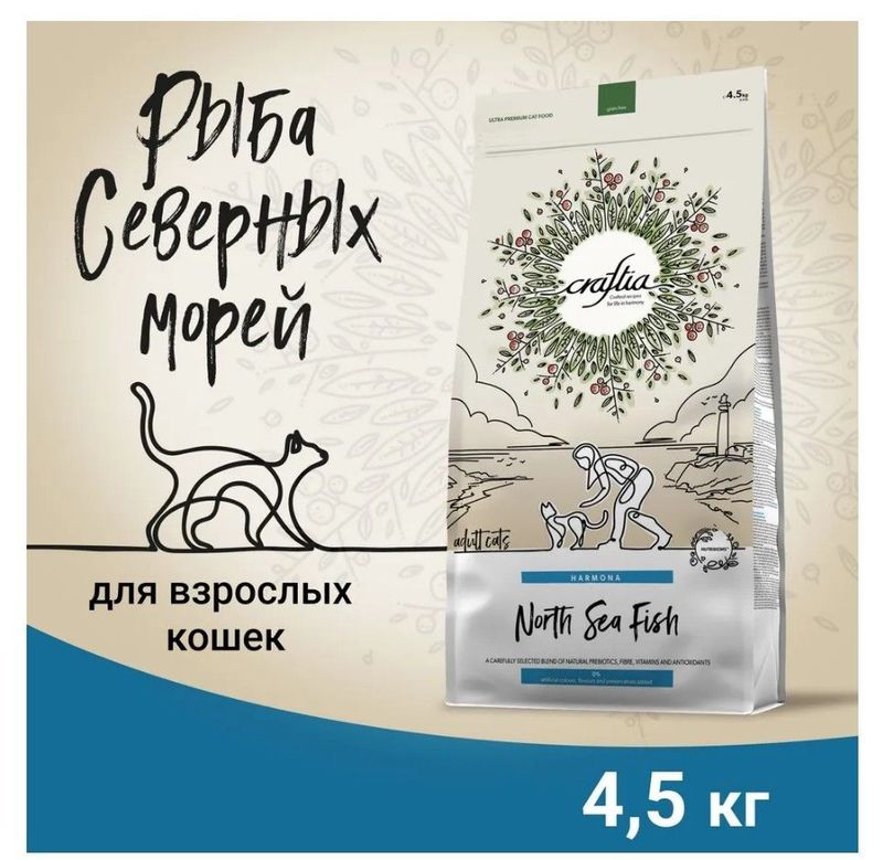 CRAFTIA HARMONA сухой корм для взрослых кошек из рыбы северного моря CRAFTIA HARMONA — корм для кошек ультрапремиум класса, созданный с любовью к природе. Состав кормов CRAFTIA прозрачен и понятен, отсутствуют скрытые добавки и сомнительные ингредиенты. Все, что заявлено в составе корма, гарантированно присутствует в каждой грануле. Собственный завод, сотни квадратных метров научно-исследовательских лабораторий, первоклассное сырье — все это позволяет создавать тщательно сбалансированный высокобелковый корм с холистическим подходом. Все компоненты корма подходят для употребления человеком и не содержат ГМО. Продукт соответствует высоким стандартам качества и имеет следующие сертификаты соответствия: HACCP, ISO 9001, ISO 14001, ISO 18001, ISO 45001, DQS, IFS. Ингредиент №1 — свежее мясо. Это лучший источник белка из возможных. Кроме того, он делает вкус корма очень привлекательным для питомцев. Запатентованная формула NUTRIBIOME — тщательно подобранная смесь пребиотиков, клетчатки, мультивитаминов, антиоксидантов. Функциональные добавки — Омега-6 и Омега-3. Жирные кислоты помогают поддерживать здоровье кожи и шерсти, играют важную роль в поддержании здоровья сердечно-сосудистой системы, обладают противовоспалительными свойствами. Бурые водоросли ASCOPHYLLUM NODOSUM уменьшают зубной налет, неприятный запах, кровоточивость десен, сокращают образование зубного камня. Получается, что во время еды питомец одновременно чистит зубы: Ascophyllum nodosum размягчает зубной налет, а при жевании сухих гранул этот налет механически удаляется. 0% искусственных красителей, ароматизаторов, консервантов. 0% ГМО. 0% химической обработки сырья. Основные источники белка в корме — свежее мясо лосося и сельди. Они богаты незаменимыми Омега-3 жирными кислотами и минеральными веществами. Жирные кислоты контролируют воспалительные процессы в организме, что хорошо влияет на здоровье суставов. Легкоусвояемый рыбный белок способствует формированию крепкой мускулатуры, улучшает состояние кожи. Источники углеводов — предварительно обработанные гороховый крахмал и экстракт семян киноа. Эти компоненты имеют низкий гликемический индекс, а значит — питомец дольше чувствует себя сытым и не переедает. Источники клетчатки — свекольная пульпа, волокна гороха и люцерновая мука. Свекольная пульпа способствует здоровью слизистой кишечника, гороховая клетчатка стимулирует перистальтику, а люцерновая мука способствует размножению полезной микрофлоры кишечника. Суперфуды в корме — спаржа, черника, клюква, ацерола и многие другие. Суперфуды являются источниками витаминов, биологически активных компонентов и обладают антиоксидантными свойствами. Попробуйте Craftia, ощутите уверенность в качестве корма своего питомца — и наслаждайтесь жизнью в гармонии с природой!