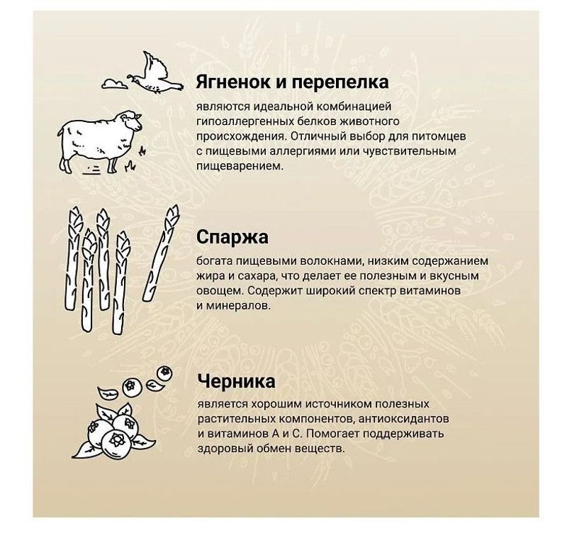 Основные источники белка в корме — свежее мясо ягненка и перепелки. Это редко встречающиеся источники белка, поэтому они подходят животным, склонным к возникновению аллергических реакций. Ягненок и перепелка — отличные источники незаменимых аминокислот, витаминов и минералов. Они легко усваиваются, помогают поддерживать оптимальный вес питомца, стабилизируют обмен веществ.