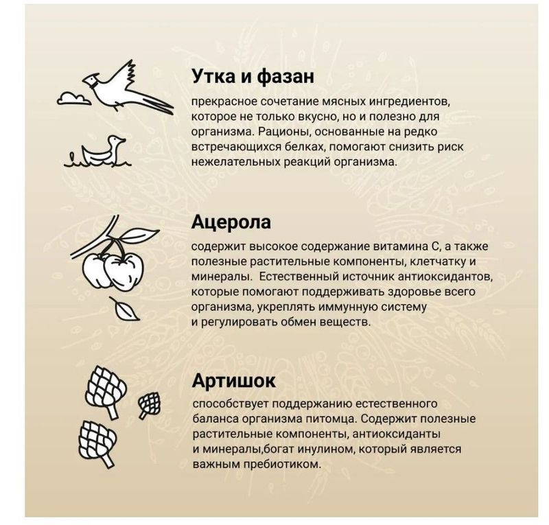 Основные источники белка в корме — свежее мясо утки и фазана. Это редко встречающиеся ингредиенты, которые отлично подходят животным, склонным к возникновению аллергических реакций. Утка и фазан богаты белками, поэтому они легко усваиваются и являются отличными источниками незаменимых аминокислот, витаминов и минералов.