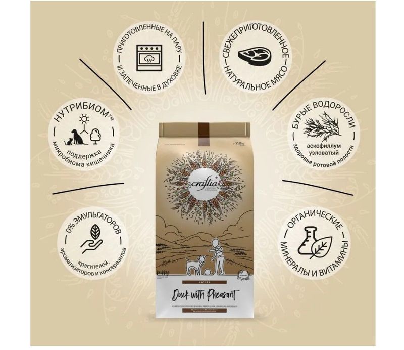 CRAFTIA NATURA сухой корм для щенков средних и крупных пород из из утки с фазаном. CRAFTIA NATURA — корм для собак ультрапремиум класса, созданный с любовью к природе. Состав кормов CRAFTIA прозрачен и понятен, отсутствуют скрытые добавки и сомнительные ингредиенты. Все, что заявлено в составе корма, гарантированно присутствует в каждой грануле. Собственный завод, сотни квадратных метров научно-исследовательских лабораторий, первоклассное сырье — все это позволяет создавать тщательно сбалансированный высокобелковый корм с холистическим подходом. Все компоненты корма подходят для употребления человеком и не содержат ГМО.