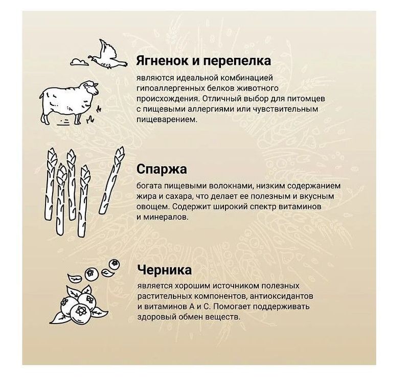 Основные источники белка в корме — свежее мясо ягненка и перепелки. Это редко встречающиеся ингредиенты, поэтому они подходят животным, склонным к возникновению аллергических реакций. Ягненок и перепелка — отличные источники незаменимых аминокислот, витаминов и минералов. Они легко усваиваются, помогают поддерживать оптимальный вес питомца, стабилизируют обмен веществ.