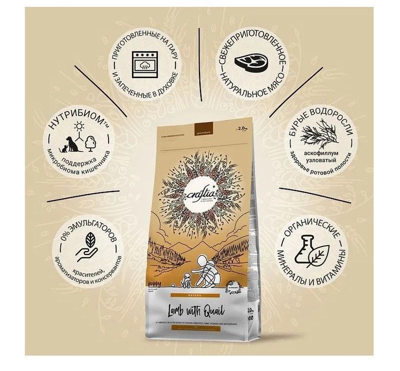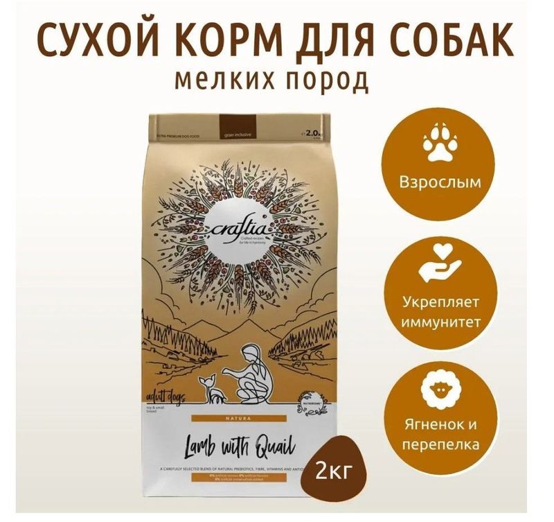 CRAFTIA NATURA Сухой корм для взрослых собак миниатюрных и мелких пород из ягненка с перепелкой. CRAFTIA NATURA — корм для собак ультрапремиум класса, созданный с любовью к природе. Состав кормов CRAFTIA прозрачен и понятен, отсутствуют скрытые добавки и сомнительные ингредиенты. Все, что заявлено в составе корма, гарантированно присутствует в каждой грануле. Собственный завод, сотни квадратных метров научно-исследовательских лабораторий, первоклассное сырье — все это позволяет создавать тщательно сбалансированный высокобелковый корм с холистическим подходом. Все компоненты корма подходят для употребления человеком и не содержат ГМО.