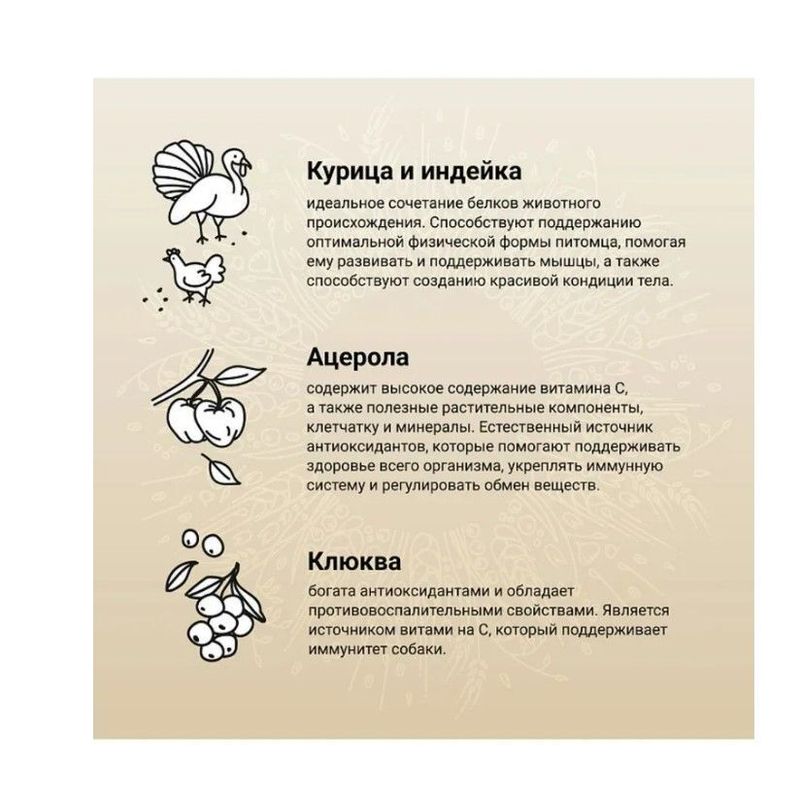 Основные источники белка в корме — свежее мясо курицы и индейки. Комбинация этих белков легко переваривается, помогает поддерживать оптимальный вес питомца, стабилизирует обмен веществ. Курица и индейка — отличные источники незаменимых аминокислот, витаминов и минералов.