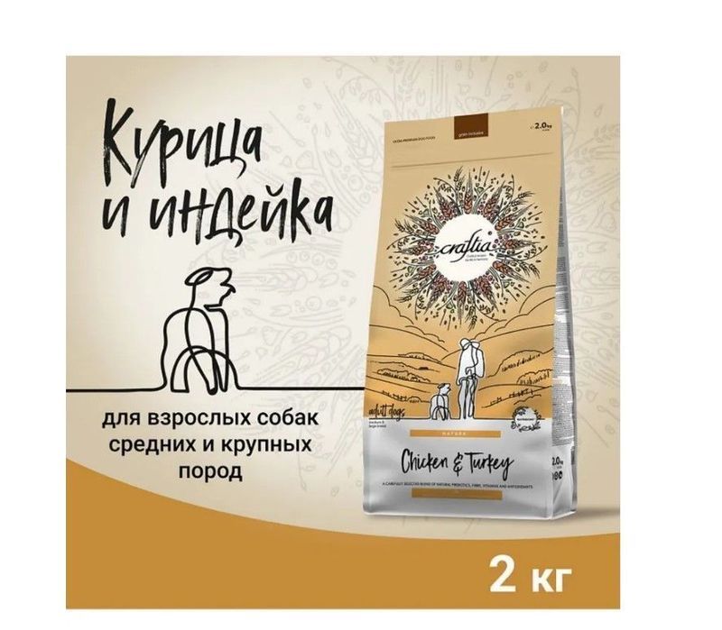 CRAFTIA NATURA сухой корм для взрослых собак средних и крупных пород из курицы и индейки. CRAFTIA NATURA — корм для собак ультрапремиум класса, созданный с любовью к природе. Состав кормов CRAFTIA прозрачен и понятен, отсутствуют скрытые добавки и сомнительные ингредиенты. Все, что заявлено в составе корма, гарантированно присутствует в каждой грануле. Собственный завод, сотни квадратных метров научно-исследовательских лабораторий, первоклассное сырье — все это позволяет создавать тщательно сбалансированный высокобелковый корм с холистическим подходом. Все компоненты корма подходят для употребления человеком и не содержат ГМО.