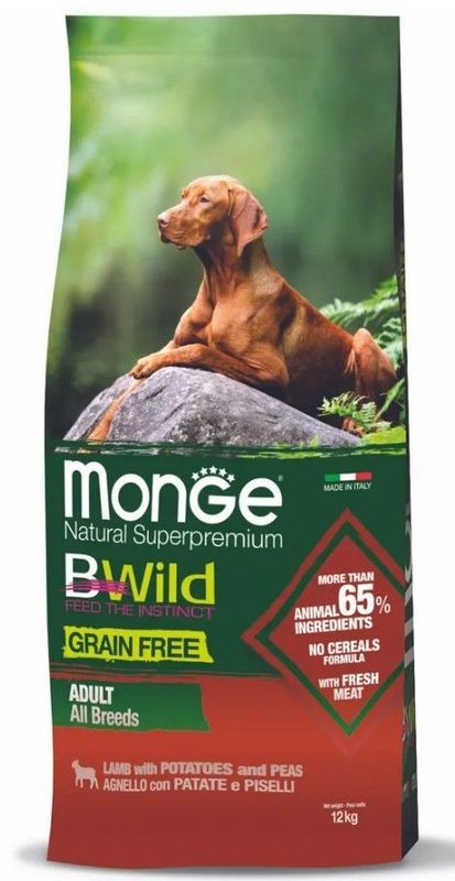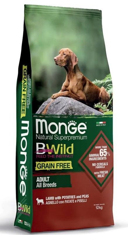Monge (Монж) Dog BWild GRAIN FREE (холистик) беззерновой сухой корм из мяса ягненка с картофелем и горохом для взрослых собак всех пород 12 кг.