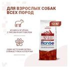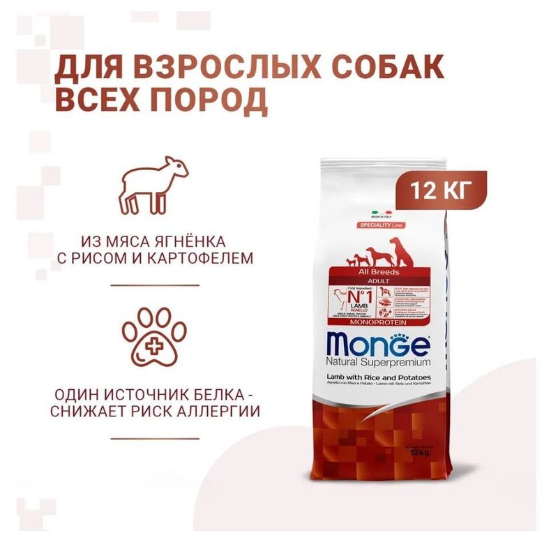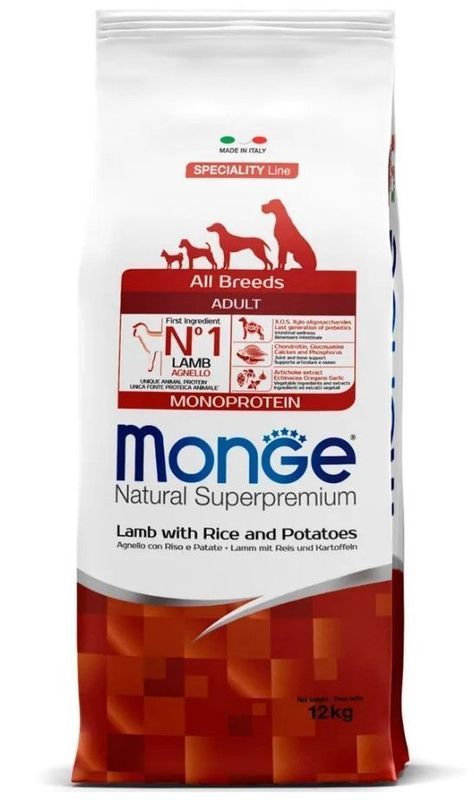 Monge (Монж) Dog Speciality Line Monoprotein сухой корм из мяса ягнёнка с рисом и картофелем для взрослых собак всех пород 12 кг. Сбалансированный полнорационный корм для взрослых собак всех пород, который разработан на основе одного источника белка животного происхождения – ягнёнка. Идеально подходит для питомцев, которые обладают повышенной чувствительностью к компонентам корма или нуждаются в исключающей диете. Пребиотики М.О.S и X.O.S. помогают сохранять естественный баланс кишечной микрофлоры и способствует оптимальному усвоению питательных веществ.Глюкозамин, хондроитин, кальций и фосфор для здоровья суставов. Эти вещества в составе корма способствуют нормальному функционированию суставов опорно-двигательного аппарата. Комплекс растительных ингредиентов и экстрактов, таких как экстракт артишока, эхинацея, орегано и чеснок, являются природными иммуностимуляторами и гепатопротекторами.Без ГМО, искусственных красителей и ароматизаторов.