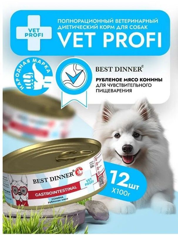 Вашему любимицу требуется особый уход и правильное питание? Тогда вам стоит обратить внимание на влажный полнорационный диетический корм для щенков с 6 месяцев и взрослых собак Best Dinner Vet Profi Нежные и вкусные консервы серии gastro помогут вашим питомцам получить максимум пользы и удовольствия от готового корма для собак. Благодаря своему составу и уникальной формуле, этот влажный корм помогает предотвратить развитие заболеваний, таких как:- воспалительные заболевания кишечника- острая и хроническая энтеропатия- констипация- панкреатит- экзокриннная недостаточность поджелудочной железы- гастрит- колитКорм для собак Gastrointestinal снижает нагрузку на пищеварительную систему, компенсирует недостаточную пищеварительную функцию, нормализует кишечную микрофлору. Высококачественный собачий корм Gastrointestinal содержит специально подобранные ингредиенты для профилактики избыточного веса. Кроме того, он легко усваивается Желудочно-кишечным трактом и не вызывает аллергических реакций. Влажная текстура мелко порубленного мяса и ароматных потрошков, полезная клетчатка и море витаминов – все это про гастроинтестинал для собак с кониной. В нем нет опасной для чувствительного кишечника клейковины, сои и пищевых вкусоароматических добавок. Только органика, благодаря которой паштеты для собак остаются полезными и неизменно вкусными. Белковую основу составляют конина. Это диетические источники незаменимых аминокислот и протеинов. Пшеничные отруби нормализуют перистальтику кишечника. Плазма крови обеспечивает высокую вкусовую привлекательность. Картофельный крахмал имеет обволакивающие свойства. Рыбий жир и морские водоросли являются источниками Омега-3 жирных кислот, уменьшающих воспаление. Дрожжи отличный источник витаминов группы В, поддерживающих нормальный обмен веществ и укрепляющих иммунитет. Топинамбур источник инулина, пребиотик для питания полезной кишечной микрофлоры. Юкка Шидигера снижает запах из лотка и способствует выведению токсинов из организма. Корм собачий влажный Бест Диннер VET PROFI Gastro Intestinal рубленое мясо обогащен всеми необходимыми витаминами и минералами, которые не только легко усваиваются и не вызывают проблем с пищеварением, но и укрепляют иммунитет, улучшают состояние шерсти и общую физическую форму собаки.Бест Диннер – это универсальная еда для собак любых размеров. В линейке Best Dinner для собак Exclusive Vet Profi Gastrointestinal вы найдете влажные консервы в банках по 340 г для крупных питомцев. Используйте такой корм для собак для овчарок, догов, мастифов, а также средних пород: немецкой овчарки и лабрадора. Консервы для собак мелких пород фасуется в баночки по 100 г. Это прекрасный корм для той тейрьера, миниатюрного мопса и пинчера, таксы и других мелких питомцев. Он обеспечит их энергией без риска ожирения, обострения гастрита или пищевой аллергии. Текстура рубленого мяса делает корм для животных собак максимально приятным даже для капризных, избирательных в еде хвостатых. Мы рекомендуем использовать корм gastrointestinal для взрослых питомцев с чувствительным пищеварением и пищевой аллергией, в период восстановления после заболеваний. Применять его как корм для щенка можно только с 6 месяцев.