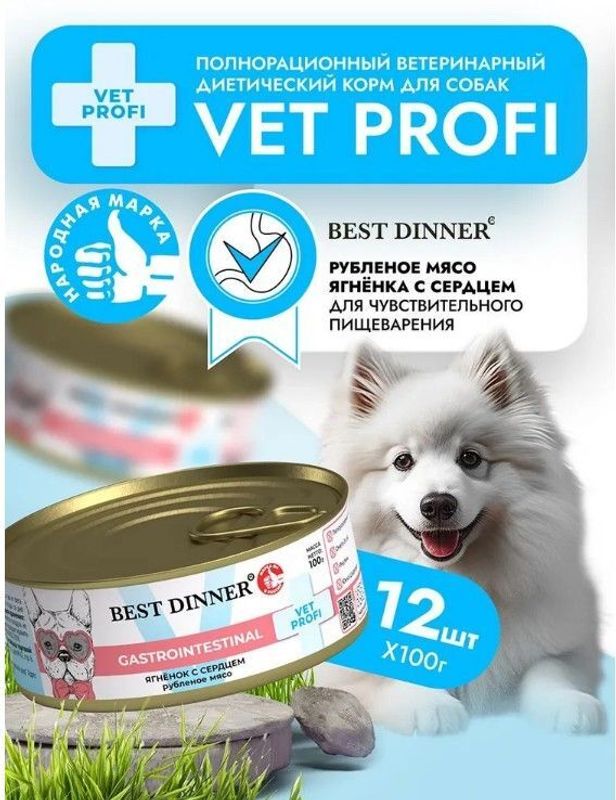 Вашему любимицу требуется особый уход и правильное питание? Тогда вам стоит обратить внимание на влажный полнорационный диетический корм взрослых собак и щенков Best Dinner Vet Profi Gastrointestinal. Нежные и вкусные консервы серии gastro помогут вашим питомцам получить максимум пользы и удовольствия от готового корма для собак. Благодаря своему составу и уникальной формуле, этот влажный корм помогает предотвратить развитие заболеваний, таких как:- воспалительные заболевания кишечника- острая и хроническая энтеропатия- констипация- панкреатит- экзокриннная недостаточность поджелудочной железы- гастрит- колит Корм для собак Gastrointestinal снижает нагрузку на пищеварительную систему, компенсирует недостаточную пищеварительную функцию, нормализует кишечную микрофлору.Высококачественный собачий корм Gastrointestinal содержит специально подобранные ингредиенты для профилактики избыточного веса. Кроме того, он легко усваивается Желудочно-кишечным трактом и не вызывает аллергических реакций. Влажная текстура мелко порубленного мяса и ароматных потрошков, полезная клетчатка и море витаминов – все это про гастроинтестинал для собак с ягненком. В нем нет опасной для чувствительного кишечника клейковины, сои и пищевых вкусоароматических добавок. Только органика, благодаря которой паштеты для собак остаются полезными и неизменно вкусными. Белковую основу составляет ягненок. Это диетические источники незаменимых аминокислот и протеинов. Пшеничные отруби нормализуют перистальтику кишечника. Плазма крови обеспечивает высокую вкусовую привлекательность. Картофельный крахмал имеет обволакивающие свойства. Рыбий жир и морские водоросли являются источниками Омега-3 жирных кислот, уменьшающих воспаление. Дрожжи отличный источник витаминов группы В, поддерживающих нормальный обмен веществ и укрепляющих иммунитет. Топинамбур источник инулина, пребиотик для питания полезной кишечной микрофлоры. Юкка Шидигера снижает запах из лотка и способствует выведению токсинов из организма. Корм собачий влажный Бест Диннер VET PROFI Gastro Intestinal рубленое мясо обогащен всеми необходимыми витаминами и минералами, которые не только легко усваиваются и не вызывают проблем с пищеварением, но и укрепляют иммунитет, улучшают состояние шерсти и общую физическую форму собаки.Бест Диннер – это универсальная еда для собак любых размеров. В линейке Best Dinner для собак Exclusive Vet Profi Gastrointestinal вы найдете влажные консервы в банках по 340 г для крупных питомцев. Используйте такой корм для собак veterinary diets для овчарок, догов, мастифов, а также средних пород: немецкой овчарки и лабрадора. Консервы для собак мелких пород фасуется в баночки по 100 г. Это прекрасный корм для той тейрьера, миниатюрного мопса и пинчера, таксы и других мелких питомцев. Он обеспечит их энергией без риска ожирения, обострения гастрита или пищевой аллергии. Текстура рубленого мяса делает корм для животных собак максимально приятным даже для капризных, избирательных в еде хвостатых. Мы рекомендуем использовать корм gastrointestinal для взрослых питомцев с чувствительным пищеварением и пищевой аллергией, в период восстановления после заболеваний. Применять его как корм для щенка можно только с 6 месяцев.