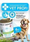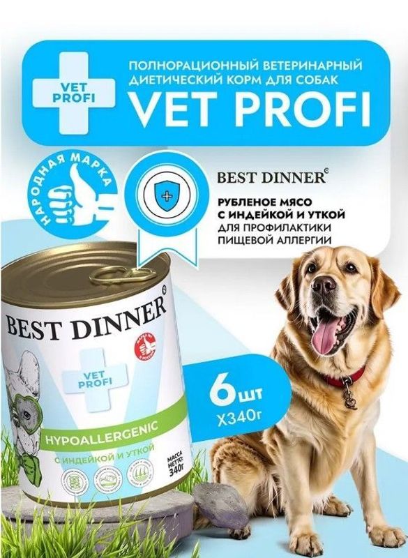 Вашему любимицу требуется особый уход и правильное питание? Тогда вам стоит обратить внимание на влажный полнорационный диетический корм взрослых собак и щенков Best Dinner Vet Profi Hypoallergenic. Нежные и вкусные консервы помогут вашим питомцам получить максимум пользы и удовольствия от готового корма для собак. Благодаря своему составу и уникальной формуле, этот влажный корм помогает предотвратить развитие заболеваний, таких как:- пищевая аллергия- дерматиты- воспалительные заболевания кожи и слизистых- непереносимость отдельных пищевых компонентов- энтеропатии, поддающиеся коррекции смены рационовЦелью высококачественного собачьего корма Hypoallergenic является исключение из рациона наиболее распространенных аллергенов. Корм для собак Hypoallergenic уменьшает проявление кожных и ЖКТ симптомов пищевой аллергии и непереносимости. Влажная текстура мелко порубленного мяса и ароматных потрошков, полезная клетчатка и море витаминов – все это про гипаллердженик для собак с индейкой и уткой. В нем нет опасной для чувствительного кишечника, сои и пищевых вкусоароматических добавок. Только органика, благодаря которой паштеты для собак остаются полезными и неизменно вкусными. Индейка и утка диетические источники незаменимых аминокислот и протеинов. Плазма крови обеспечивает высокую вкусовую привлекательность. Рыбий жир и морские водоросли являются источниками Омега-3 жирных кислот, уменьшающих воспаление. Экстракт бархатцев является источником лютеина, оказывающего противовоспалительное действие. Топинамбур источник инулина, пребиотик для питания полезной кишечной микрофлоры. Юкка Шидигера снижает запах из лотка и способствует выведению токсинов из организма. Корм собачий влажный Бест Диннер VET PROFI Hypoallergenic рубленое мясо обогащен всеми необходимыми витаминами и минералами, которые не только легко усваиваются и не вызывают проблем с пищеварением, но и укрепляют иммунитет, улучшают состояние шерсти и общую физическую форму собаки.Бест Диннер – это универсальная еда для собак любых размеров для крупных питомцев: овчарок, догов, мастифов, средних пород: немецкой овчарки и лабрадора, а также мелких пород: той тейрьера, миниатюрного мопса и пинчера, таксы и других мелких питомцев. Корм обеспечивает энергией без риска ожирения, снижает нагрузку на сердечную мышцу. Текстура рубленого мяса делает корм для животных собак максимально приятным даже для капризных, избирательных в еде хвостатых. Мы рекомендуем использовать корм для взрослых питомцев с чувствительным пищеварением и пищевой аллергией, в период восстановления после заболеваний. Применять его как корм для щенка можно только с 6 месяце