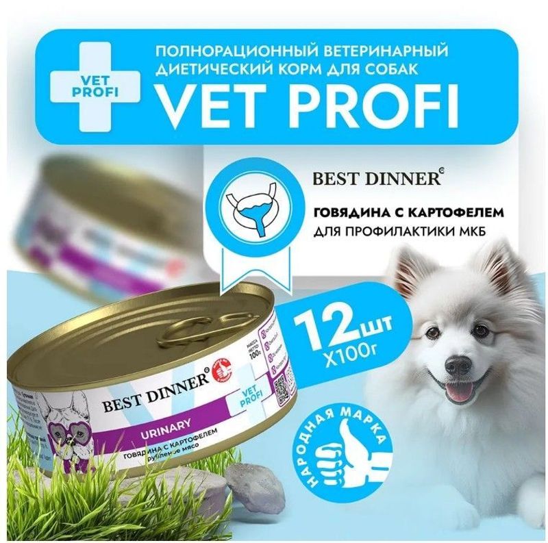 Вашему любимицу требуется особый уход и правильное питание? Тогда вам стоит обратить внимание на влажный полнорационный диетический корм взрослых собак и щенков Best Dinner Vet Profi Urinary. Высококачественный собачий корм Urinary это ветеринарная диета, основой которого являются высококачественные мясные ингредиенты, бережно приготовленные и упакованные, чтобы сохранить все полезные свойства и вкусовые качества.Благодаря своему составу и уникальной формуле, этот влажный корм помогает предотвратить развитие заболеваний, таких как:- струвитные уролиты- заболевания нижних отделов мочевыводящих путейВысококачественный собачий корм Urinary содержит пониженное содержание магния и фосфора в составе. Натуральные добавки будут стимулировать собаку больше пить для снижения концентрации мочи.Влажная текстура мелко порубленного мяса и ароматных потрошков, полезная клетчатка и море витаминов – все это про уринари для собак с говядиной. В нем нет опасной для чувствительного кишечника сои и пищевых вкусоароматических добавок. Только органика, благодаря которой паштеты для собак остаются полезными и неизменно вкусными. Говядина является диетическим источником незаменимых аминокислот и протеинов. Плазма крови обеспечивает высокую вкусовую привлекательность. Картофельный крахмал имеет обволакивающие свойства. Рыбий жир и морские водоросли являются источниками Омега-3 жирных кислот, уменьшающих воспаление. Дрожжи отличный источник витаминов группы В, поддерживающих нормальный обмен веществ и укрепляющих иммунитет. DL-метионин нормализует pH мочи. Юкка Шидигера снижает запах из лотка и способствует выведению токсинов из организма. Корм собачий влажный Бест Диннер VET PROFI Urinary рубленое мясо обогащен всеми необходимыми витаминами и минералами, которые не только легко усваиваются и не вызывают проблем с пищеварением, но помогает снижать воспалительные процессы, укрепляет иммунитет и нормализует обмен веществ. Кроме того, корм помогает быстрее справиться с заболеваниям нижних отделов мочевыводящих путей.Бест Диннер – это универсальная еда для собак любых размеров. В линейке Best Dinner для собак Exclusive Vet Profi Urinary вы найдете влажные консервы в банках по 340 г для крупных питомцев. Используйте такой корм для собак для овчарок, догов, мастифов, а также средних пород: немецкой овчарки и лабрадора. Консервы для собак мелких пород фасуется в баночки по 100 г. Это прекрасный корм для той тейрьера, миниатюрного мопса и пинчера, таксы и других мелких питомцев. Текстура рубленого мяса делает корм для животных собак максимально приятным даже для капризных, избирательных в еде хвостатых. Мы рекомендуем использовать корм Urinary для взрослых питомцев при струвитном уролитиазе, а также в период восстановления после заболеваний. Применять его можно и для щенков с 6 месяцев.