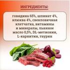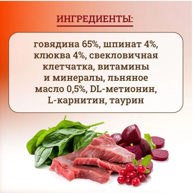 Говядина 65%, шпинат 4%, клюква 4%, свекловичная клетчатка, витамины и минералы, льняное масло 0,5%, DL-метионин, L-карнитин, таурин.