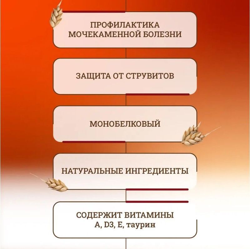 Витамины и минералы на 1 кг: витамин А 5000 МЕ/кг, витамин D3 180 МЕ/кг, витамин Е 16 МЕ/кг, таурин 472 мг/кг.
