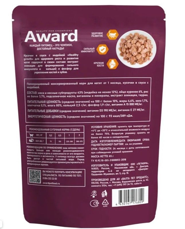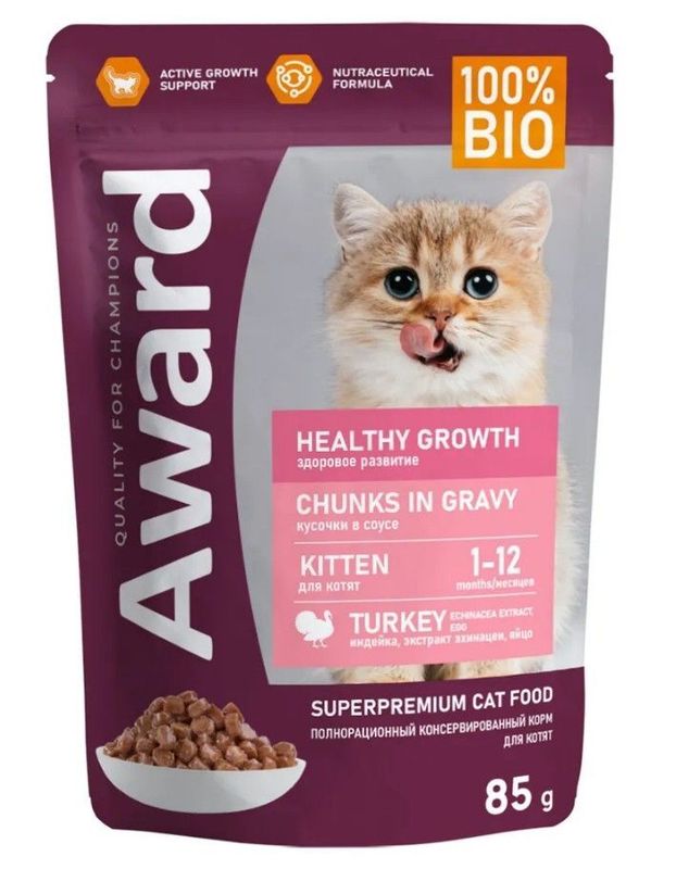 мясо и мясные субпродукты 43% (индейка не менее 12%), яйцо куриное 6%, рис не более 3,7%, подсолнечное масло, витамины и минералы, экстракт эхинацеи, таурин.