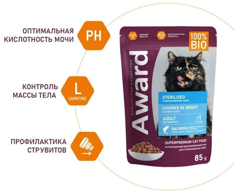 мясо и субпродукты 37% , лосось не менее 6%, рис не более 3,5%, витамины и минералы, подсолнечное масло, клюква, DL-метионин, L-карнитин, таурин.