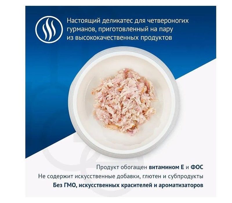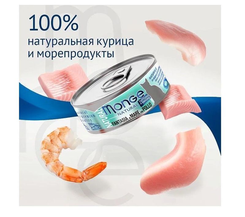 Курица 25%, смесь морепродуктов (белая рыба, тунец, креветки, кальмары, сурими) 47%, рис 1%, фруктоолигосахариды (ФОС). Питательная ценность: сырой белок 16%, сырые жиры 1%, сырая клетчатка 0,5%, сырая зола 1%, влажность 79%.Энергетическая ценность: 825 ккал/кг.Питательные добавки в 1 кг: витамин Е (альфа-токоферол) 50 мг.