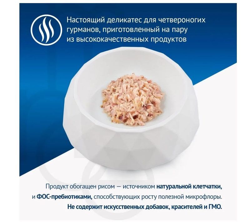 Желтоперый тунец (Thunnus Albacares) 47,5%, креветки (Metapenaeus spp.) 5%, рис, F.O.S. (фруктоолигосахариды).