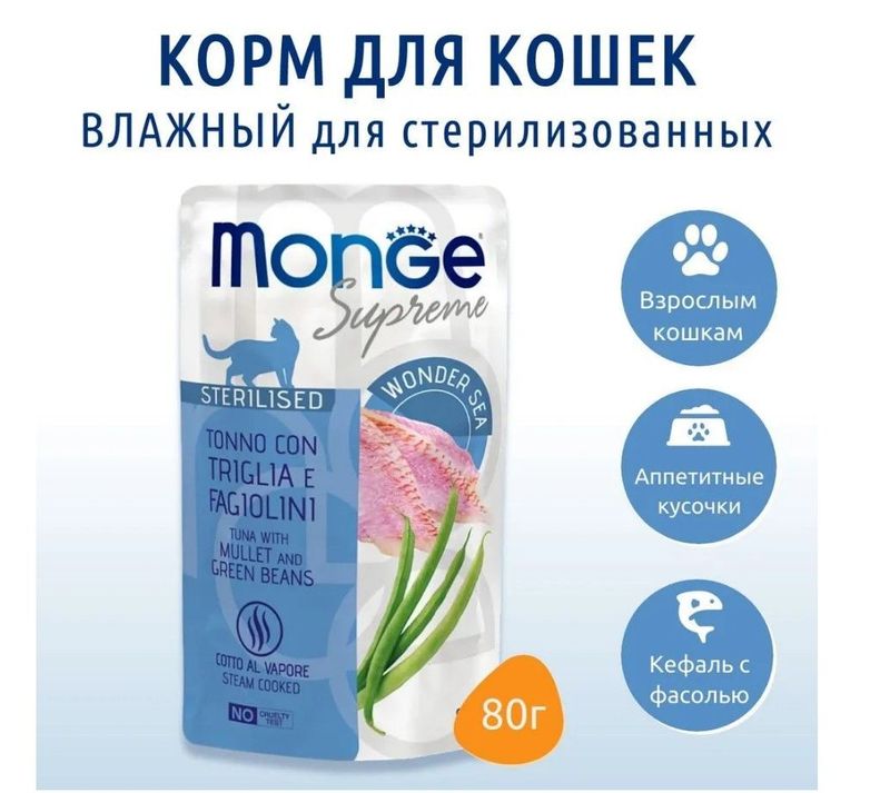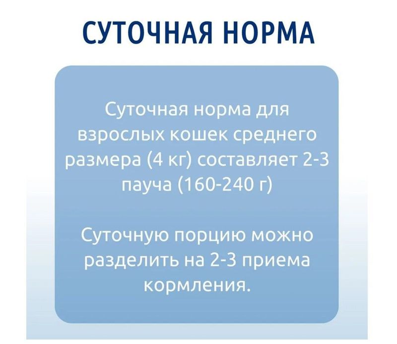 Тунец 50%, кефаль 4%, зеленая фасоль 4%, рис, очищенное подсолнечное масло, фруктоолигосахариды (ФОС) 0,04%.Питательная ценность: сырой белок 15%, сырая клетчатка 0,1%, сырой жир 2%, сырая зола 2%, влага 79%.Энергетическая ценность: 909 ккал/кг.Питательные добавки в 1 кг: витамин Е (альфа-токоферол) 50 мг.