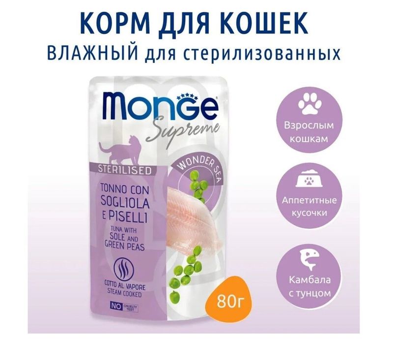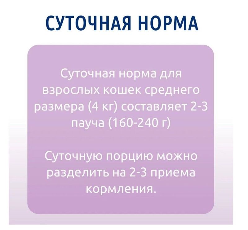Тунец 50%, камбала 4%, зелёный горошек 4%, рис, очищенное подсолнечное масло, фруктоолигосахариды (ФОС) 0,04%.Питательная ценность: сырой белок 15%, сырая клетчатка 0,1%, сырой жир 2%, сырая зола 2%, влага 79%.Энергетическая ценность: 909 ккал/кг.Питательные добавки в 1 кг: витамин Е (альфа-токоферол) 50 мг.
