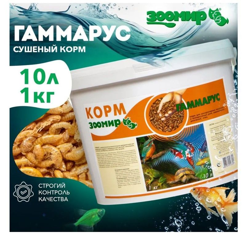 Зоомир Корм сухой для крупных и средних рыб Гаммарус, стимулирующий окраску, 1 кг/10 л. Гаммарус - пресноводные рачки, обитающие в крупных озерах Сибири. Отличается высоким содержанием веществ, укрепляющих здоровье рыб и повышающих интенсивность их естественной окраски. Рекомендуется для всех видов аквариумных рыб, как пресноводных, так и морских. Этот рачок является важной составляющей кормового рациона водяных и сухопутных черепах и других обитателей аквариумов и террариумов. Состав: Гаммарус естественной сушки Рекомендации по кормлению:кормить 1-2 раза в день. Корм давать небольшими порциями, которые рыбы могут съесть в течение нескольких минут. Не перекармливать. Следует иметь в виду, что несъеденные остатки корма являются причиной порчи воды и многих заболеваний рыб, особенно при избыточном кормлении.
